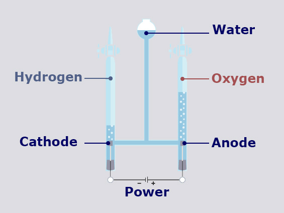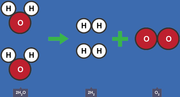 The electrolysis of the water process splits the water molecules (H2O) into Hydrogen (H2) and Oxygen (O2) molecules according to the following expression: